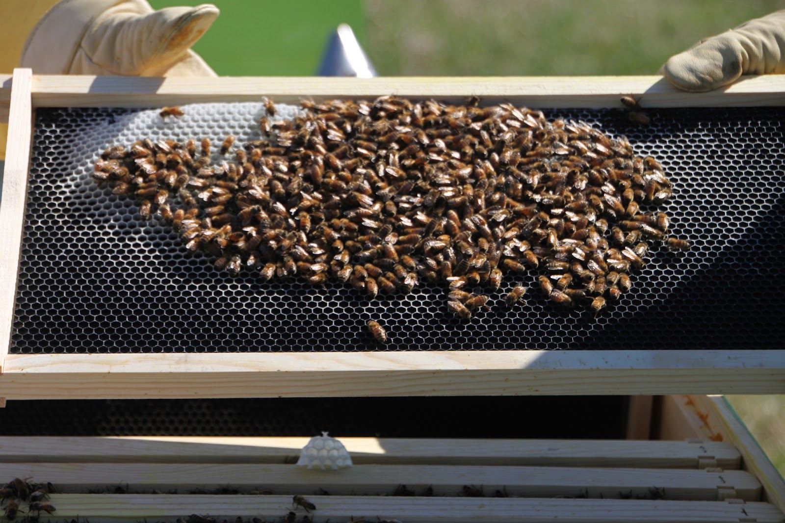 | Bees and wax. The frame is heavy. This is a new hive and the bees need to build out the wax foundation. They need lots of syrup to help them build faster. |